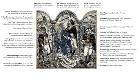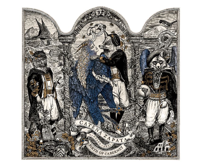 Our  allegory  of  the  vines  as  animals  gives  a  whimsical rendering  of  the  story.  The  fox  –Cabernet  Franc–  has attributes of Cardinal Richelieu, the first famous lover of the said grape. The siren –part woman, part bird– represents Sauvignon Blanc in all her savage glory. On the right, their child –Cabernet Sauvignon – is depicted as a world traveller, adventuring from the French Pyrenees to the Catena Zapata pyramid, at the foothills of the Andes, in Argentina.